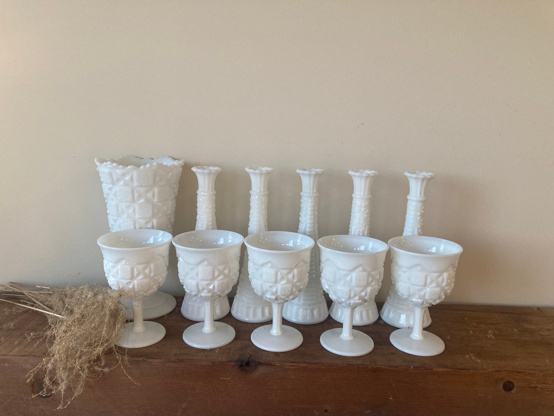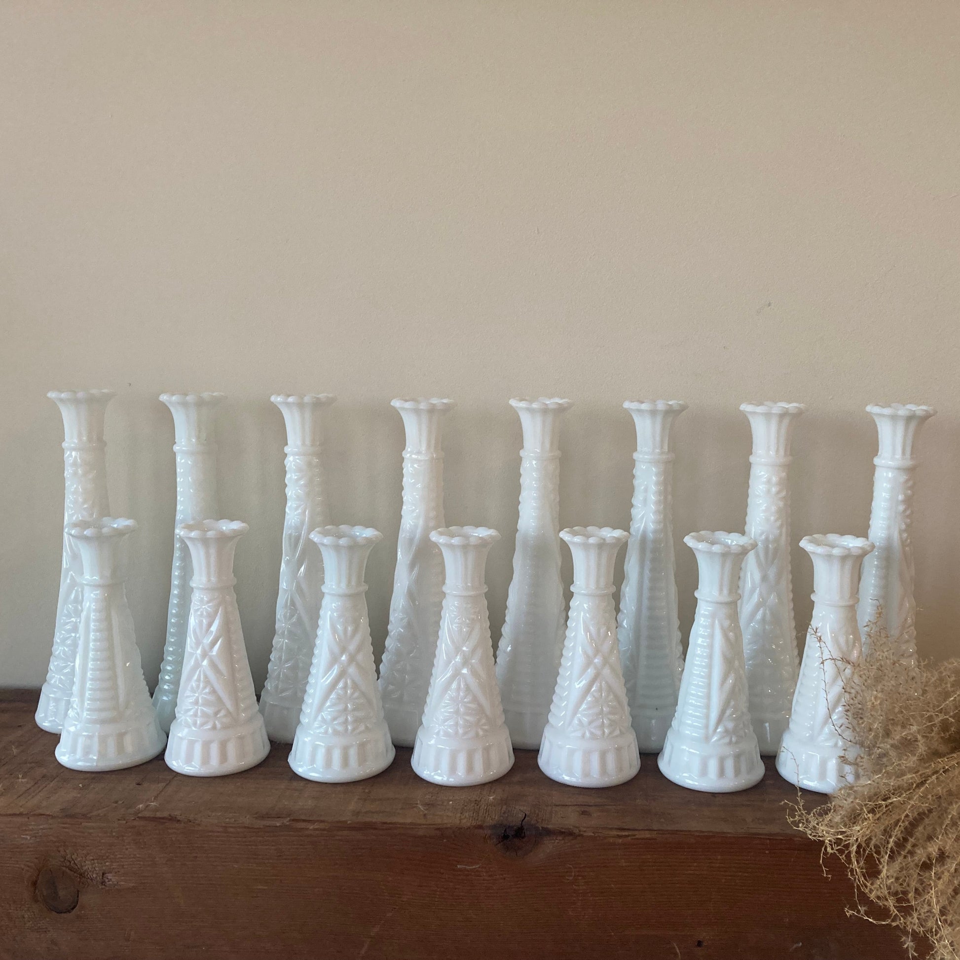 Discover the charm of classic vintage milk glass with our per-table rental options! A table rental includes a single large vase and or a collection of smaller pieces of varying heights to create a unique and customizable display. For a personalized experience, contact us through our contact feature and schedule a consultation.